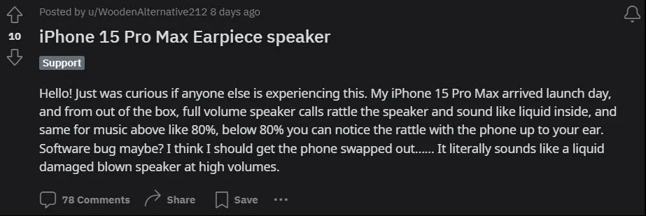 Keluhan ini pertama kali muncul di Reddit, di mana pengguna dengan nama WoodenAlternative212 membagikan pengalamannya dengan iPhone 15 Pro Max-nya. Menurutnya, masalah ini muncul sejak hari pertama penggunaannya, dan audio terdengar seperti speaker yang rusak terkena air.