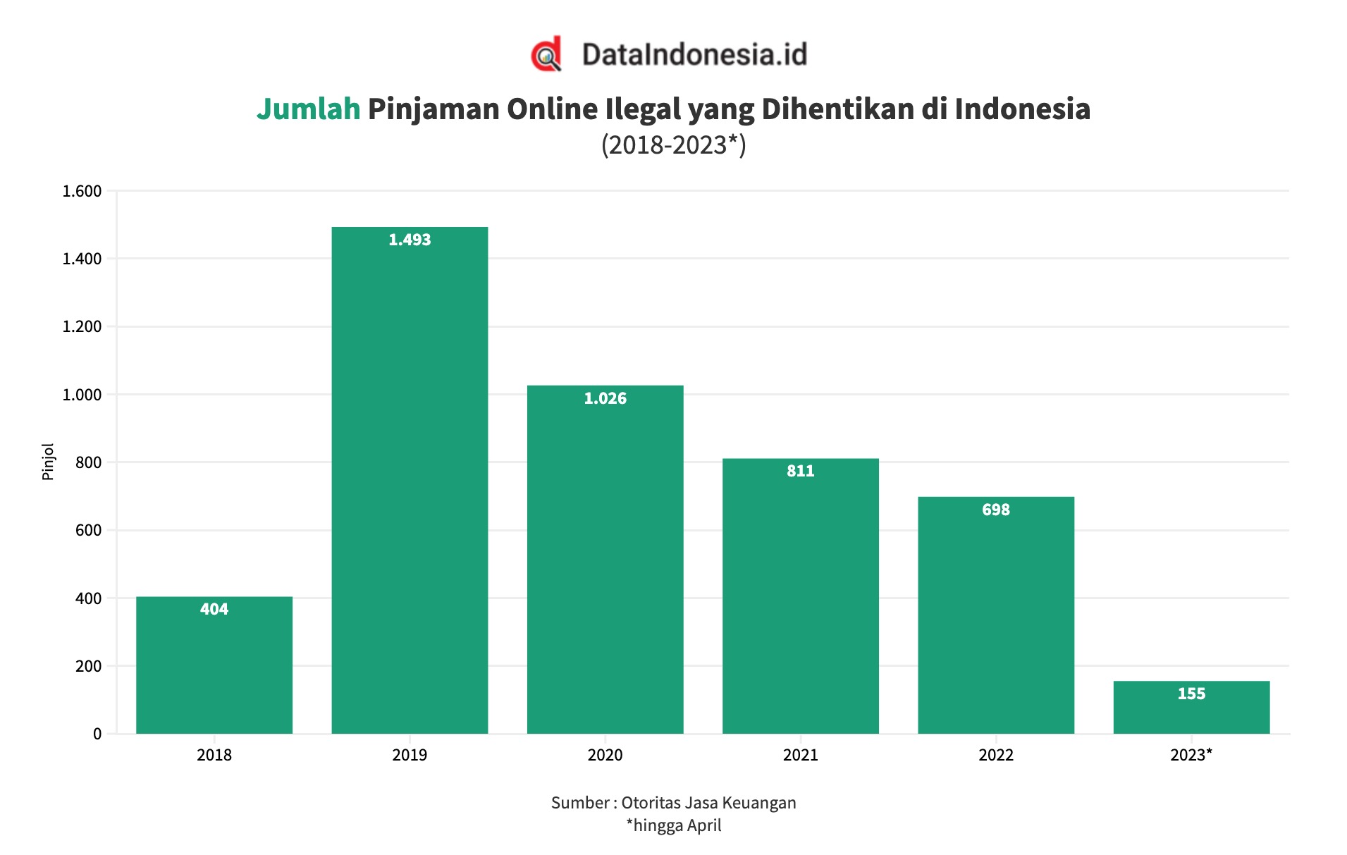 Seperti yang dilansir dari Data Indonesia, bahwa menurut data dari Otoritas Jasa Keuangan (OJK), sebanyak 155 platform pinjaman online (pinjol) ilegal telah dihentikan kegiatan operasinya hingga 30 April 2023. Dibandingkan dengan tahun 2019, jumlah penghentian pinjol ilegal juga mengalami penurunan di Indonesia, dengan jumlah penghentian pinjol ilegal sebanyak 1493 di tahun tersebut.